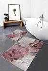Geometrik desenli, pembe ve gri renk tonlarının uyumuyla tasarlanmış bu 2'li banyo paspas seti, modern ve şık banyolar için mükemmel bir seçimdir.
