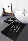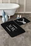 RealHomes Geometrik Geyik Ve Yazılı Siyah Beyaz Desenli 2'Li Kaymaz Taban Yıkanabilir Banyo Paspas Seti