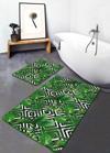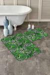 Geometrik siyah-beyaz zemin üzerine hareketli yeşil yaprak desenleriyle tasarlanmış bu 2'li banyo paspas seti, modern banyolar için ideal bir seçimdir.