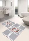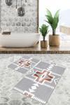 RealHomes Gri Zeminde Etnik Geometrik Desenli Turuncu Beyaz 2'Li Kaymaz Taban Yıkanabilir Banyo Paspas Takımı