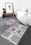 Gri zemin üzerinde etnik ve geometrik desenlerle süslenmiş turuncu ve beyaz detaylarıyla şık bir kombin sunan 2'li banyo paspas setidir.