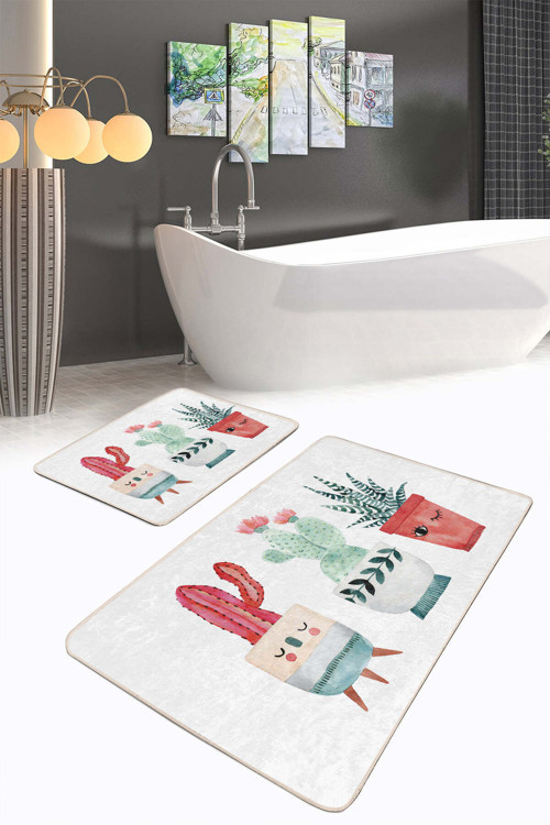 Kaktüs ve sukulent desenli beyaz-pembe modern tasarıma sahip bu 2'li kaymaz tabanlı banyo paspas seti, banyonuza ferah ve enerjik bir görünüm kazandırır.
