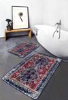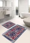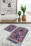 RealHomes Kırmızı Lacivert Geometrik Etnik Desenli 2'Li Kaymaz Taban Yıkanabilir Banyo Paspas Takımı