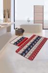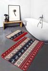 Kırmızı ve lacivert renklerin hakim olduğu, geleneksel geyik deseniyle bezeli bu 2'li banyo paspas seti, banyonuza sıcak ve rustik bir atmosfer katıyor.
