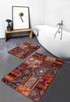 Kırmızı ve turuncu renklerin hakim olduğu kilim desenli 2'li banyo paspas seti, banyonuza sıcak ve etnik bir atmosfer katmak için ideal bir seçimdir.