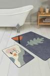 Koyu lacivert ve gri tonlarında yaprak ve soyut yüz desenli 2'li banyo paspas seti, modern ve sanatsal tasarımıyla banyonuza şıklık katıyor.
