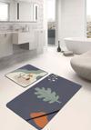 RealHomes Koyu Lacivert Gri Yaprak Ve Soyut Yüz Desenli 2'Li Kaymaz Taban Yıkanabilir Banyo Paspas Seti