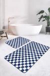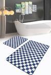 Lacivert beyaz kareli modern geometrik desenli 2'li banyo paspas seti, banyonuza şıklık ve fonksiyonellik katar.