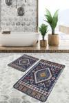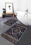 Lacivert zeminde geleneksel etnik motiflerin yer aldığı klasik tarzda 2'li banyo paspas seti, banyonuza zarif ve şık bir görünüm kazandırır.