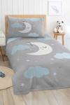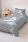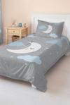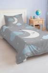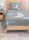 Mavi ay desenli bu tek kişilik çocuk ve genç odası pike takımı, hem dekoratif hem de günlük kullanıma uygun bir seçenektir.