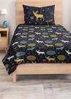 Mavi renkte geyik ve kar deseniyle tasarlanmış bu çocuk ve genç odası pike takımı, hem dekoratif hem de günlük kullanıma uygundur.