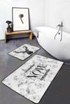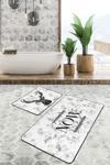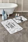 Mermer desenli zemin üzerinde siyah geometrik geyik figürü ve motiv içeren modern tarzda tasarlanmış 2'li banyo paspas seti ile banyonuza şıklık katın.