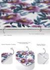 Canlı ve gerçekçi 3D dijital baskı teknolojisiyle üretilen mor çiçekli yaprak desenleri, su ve lekeye dayanıklı parlak kadife kumaş yüzeyinde uzun süre solmadan dayanır.