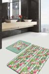 RealHomes Pembe Flamingo Ve Yeşil Yapraklı Tropikal Desenli 2'Li Kaymaz Taban Yıkanabilir Banyo Paspas Takımı