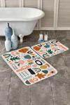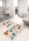 Renkli soyut figürlerle süslenmiş bej zeminli bu 2'li banyo paspas seti, modern ve özgün tasarımıyla banyonuza canlılık katar.
