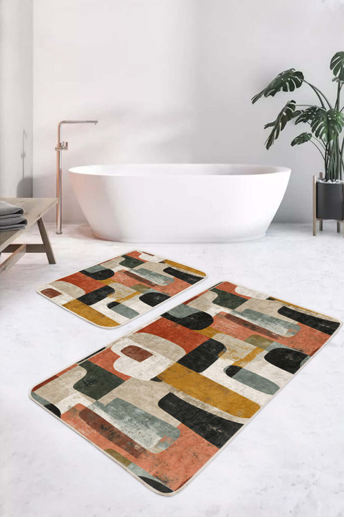 Retro geometrik desenli, turuncu ve siyah renklerin canlı uyumuyla tasarlanmış 2'li banyo paspas seti modern ve şık banyo dekorasyonu arayanlar için idealdir.