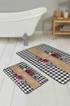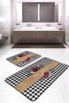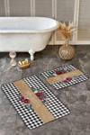 RealHomes Siyah Beyaz Ekose Desenli Kırmızı Çiçekli 2'Li Kaymaz Taban Yıkanabilir Banyo Paspas Takımı