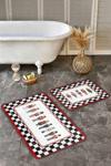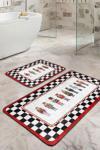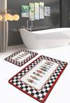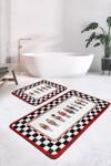 RealHomes Siyah Beyaz Kareli Kırmızı Çerçeveli Figürlü 2'Li Kaymaz Taban Yıkanabilir Banyo Paspas Seti