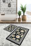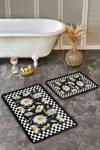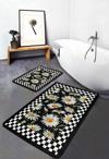 Siyah zemin üzerinde beyaz papatya çiçekleri ve siyah-beyaz kareli desenle zarif ve şık bir banyo dekorasyonu sunan 2'li kaymaz tabanlı banyo paspas seti.