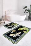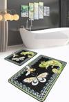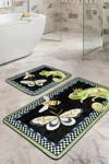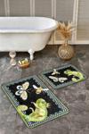 RealHomes Siyah Zemin Üzerinde Yeşil Bukalemun Ve Kelebekli 2'Li Kaymaz Taban Yıkanabilir Banyo Paspas Seti