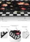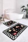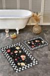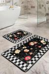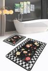 Siyah zemin üzerinde beyaz kareli çerçeve ile çevrili, kırmızı, sarı ve turuncu tonlarında çiçek desenleriyle bezenmiş estetik ve şık tasarım 2'li banyo paspas seti.