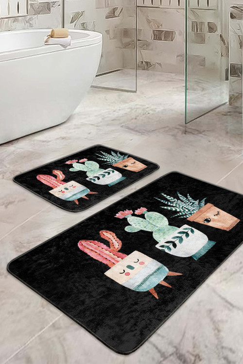 RealHomes Siyah Zeminde Sevimli Kaktüs Desenli Renkli 2'Li Kaymaz Taban Yıkanabilir Banyo Paspas Seti