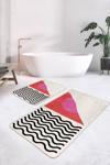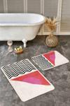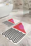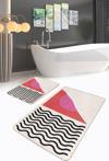 Soyut dalga ve üçgen desenleriyle kırmızı ve mor renklerin modern buluşması bu 2'li banyo paspas seti, banyolarınıza şıklık ve canlılık katmak için tasarlandı.
