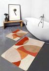Turuncu ve bej renklerde geometrik soyut desenlerle tasarlanmış bu şık 2'li banyo paspas seti, modern ve estetik bir görünüm sunar.