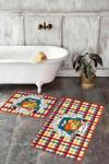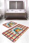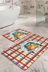RealHomes Turuncu Kabak Desenli Kırmızı-Mavi Kareli 2'Li Kaymaz Taban Yıkanabilir Banyo Paspas Takımı