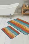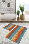 Turuncu ve mavi renklerin uyumuyla oluşturulmuş dalgalı etnik desenli 2'li banyo paspas seti, banyonuza sıcak ve karakteristik bir dokunuş katmak için ideal bir tercih.