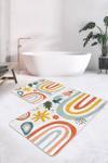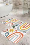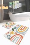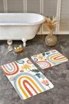 Turuncu ve mavi renklerde retro çizgiler ve çiçek desenleriyle bezenmiş bu 2'li banyo paspas seti, dekorunuza sıcak ve neşeli bir dokunuş katmak için ideal bir tercihtir.