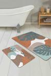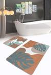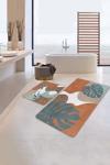 Turuncu ve mavi tonlarında yaprak desenli, modern soyut tasarıma sahip 2'li banyo paspas seti, banyonuza ferah ve şık bir atmosfer katar.