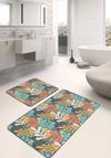 Turuncu ve mavi yaprak desenli bu 2'li banyo paspas seti, modern ve doğal tasarımıyla banyonuzda şık bir atmosfer yaratır.