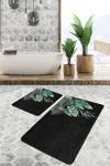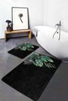 RealHomes Yaprak Desenli Siyah Zeminde Yeşil Tonlarında 2'Li Kaymaz Taban Yıkanabilir Banyo Paspas Takımı
