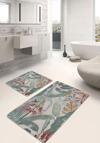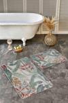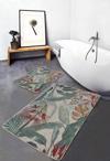 Bu şık 2'li banyo paspas seti, yeşil ve kırmızı renklerle bezenmiş tropikal yaprak baskısına sahip modern bir tasarım sunar.