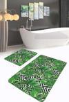 RealHomes Yeşil Siyah Zeminli Tropikal Yaprak Desenli 2'Li Kaymaz Taban Yıkanabilir Banyo Paspas Seti
