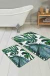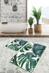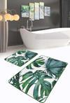 Yeşil tropikal yaprak desenli modern tasarıma sahip bu 2'li banyo paspas seti, banyonuza ferah ve doğal bir atmosfer katmak için ideal.