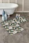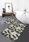 Yeşil ve bej tropikal yaprak desenli 2'li kaymaz taban yıkanabilir banyo paspas seti, banyonuza doğal ve canlı bir atmosfer kazandırır.