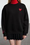 Regular Bisiklet Yaka Düşük Kol Regular Nakışlı Normal Kalıp Kalın İçi Polarlı Örme Sweatshirt