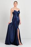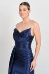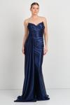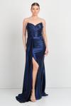 Detay: Likralı saten kumaş, göğüs ve belde drape detaylı, derin yırtmaçlı, balık form, yandan kuyruk detaylı, astarlı ve fermuarlı abiye elbiseler, zarafeti ve ihtişamı bir araya getirerek özel davetlerde göz kamaştırıcı bir görünüm sunar. Esnek yapısıyla likralı saten kumaş vücuda mükemmel uyum sağlarken, göğüs ve beldeki drape detayları elbiseye hareketli ve sofistike bir hava katar. Derin yırtmaç cesur ve etkileyici bir dokunuş eklerken, balık form vücut hatlarını kusursuz bir şekilde sararak feminen bir siluet oluşturur. Yandan kuyruk detayı elbiseye dramatik ve gösterişli bir hava katarken, astarlı yapısı konfor sunar ve fermuarlı tasarım pratik kullanım sağlar. Bu tasarım, hem klasik hem de modern bir tarzı yansıtarak özel günlerde unutulmaz bir stil oluşturur;