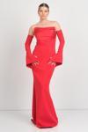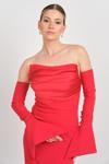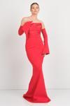 Detay: Göğüs ve kolları saten, göğüs drapeli, diğer kısımları tamamen krep kumaştan oluşan, seyyar kollu, astarlı, fermuarlı, bilekten düğmeli ve balık form abiye elbiseler, zarafeti ve ihtişamı bir araya getirerek özel davetlerde göz kamaştırıcı bir görünüm sunar. Saten kumaşın parlak dokusu üst bedene sofistike bir hava katarken, drapeli göğüs detayı feminen ve şık bir dokunuş sağlar. Krep kumaşın akıcı yapısı konfor sunarken, seyyar kollar hareketli ve zarif bir stil yaratır. Fermuarlı tasarım pratik kullanım sağlarken, bilekten düğmeli detaylar ince ve zarif bir tamamlayıcı unsur oluşturur. Balık formu vücuda mükemmel şekilde oturarak göz alıcı bir siluet oluşturur. Bu tasarım, hem klasik hem de modern bir tarzı yansıtarak özel günlerde unutulmaz bir stil oluşturur;