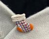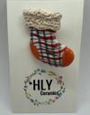 Renkli Çorap seramik yaka iğnesi, kımızı mavi ekose ve turuncu detaylarıyla el emeğinin zarafetini taşıyor.