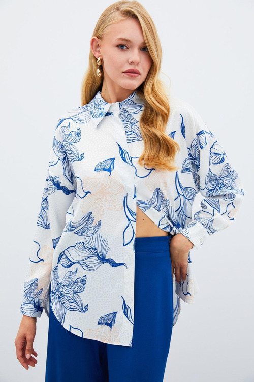 Gizli pat, yanlar mini yırtmaçlı, uzun manşetli kol, renkli desenli salaş gömlek.