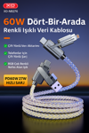 Qasul Renkli Işıklı 4’ü 1 Arada Çok Fonksiyonlu Hızlı Şarj Kablosu 60W Telefon, 27W Type-C to iPhone