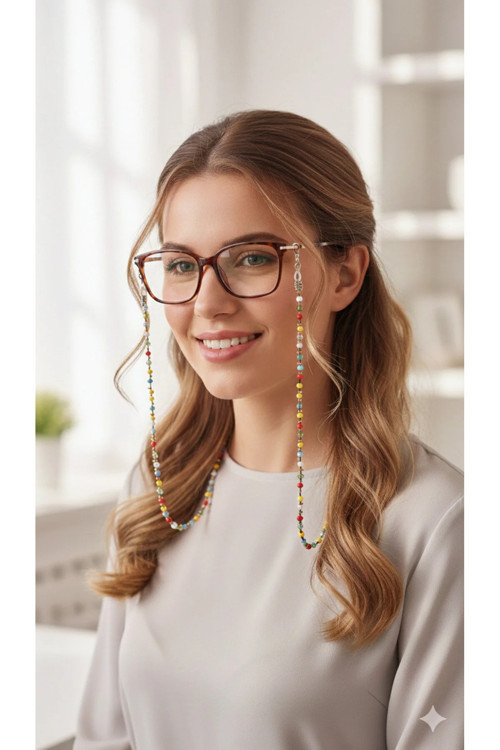 - Kadın ve kızlar için özel olarak tasarlanmış, şık ve zarif bir aksesuar.; - Yetişkinlerin günlük kullanımına uygun, dayanıklı ve kaliteli malzemeden üretilmiştir.; - Türkiye'de üretilmiş olup, yerel işçilik ve tasarımın gururunu taşır.; - Gözlüklerinizi kaybetmenizi önleyen pratik ve estetik bir çözüm sunar.; - Renkli kristal taş detaylarıyla göz alıcı bir görünüm sağlar ve tarzınızı tamamlar.;
