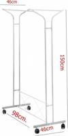 150 cm yüksekliğinde v şeklinde iki askı borusu bulunan 45 cm derinliğinde 98 cm genişliğinde tamamen metal malzemeden oluşan konfeksiyon elbise askısıdır. Demonte olarak gelecektir. Kurulumu 1 tornavida ile yapılabilir.