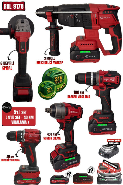 Ev, atölye ve profesyonel kullanım için özel olarak tasarlanan RETOOLS RKL-9178 5’li set, güçlü performansı ve çok yönlü kullanım özellikleriyle tüm işlerinizi kolaylaştırır. Delme, kırma, vidalama, somun sıkma ve taşlama işlemlerini tek set içerisinde sunan bu kapsamlı takım seti, dayanıklı yapısı ve yüksek tork gücü ile öne çıkar.