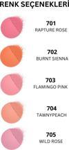 mat ve çok hafif ışıltılı çeşitleriyle, ipeksi bir hisse, doğal bir bitişe sahiptir. Karşı konulamaz yumuşaklıktaki Mikro toz pudra pigmentleri farklı tonlarda birbirleriyle harmanlanarak farklı, hoş uygulama deneyleri sunar. Her cilt tonuna istenilen yoğunlukta uygulanarak adapte edilebilen ürün, en yoğun uygulamada bile son derece doğal sonuçlar verir. KULLANIM ŞEKLİ: Allık fırçası yardımıyla elmacık kemiklerinin üzerine uygulanır. Koyu tonlar tercih edildiğinde fırçaya az miktarda ürün alınarak elmacık kemiği üzerinde kolaylıkla dağıtılabilir. Aynı şekilde açık tonlarda az miktarda ürünle başlayıp uygulama bölgesi genişletilerek istenilen yoğunluğa ulaşana kadar bir kaç kat uygulama yapılabilir. Fırçada kalan fazla ürün saç çizgisi, burun kemiği ve çene bölgesine sürülebilir. Yüze daha fazla boyut kazandırmak için elmacık kemiklerine ışıltılı bir ton, yanak boşluklarına ise mat yapıda farklı bir tonda allık uygulayabilirsiniz. NOT: Renklerin yanaklardaki görünümü