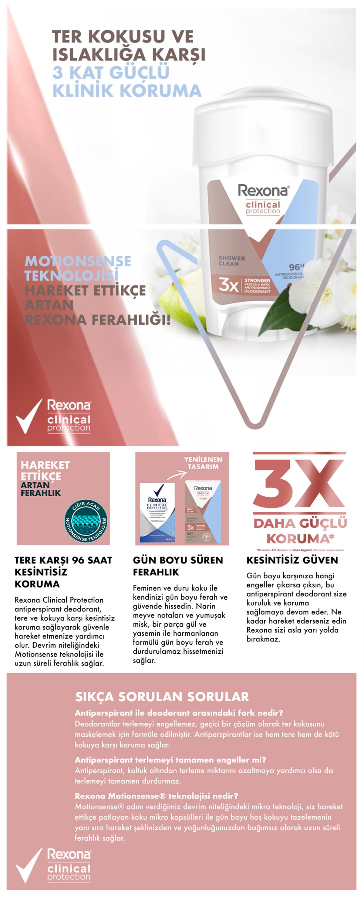 Ter kokusu ve ıslaklığa karşı 3 kat daha güçlü koruma. Klinik Koruma... Rexona Clinical Protection Shower Clean Stick Deodorant. Herkes terler. Bazılarımız diğerlerinden daha fazla ve sebepsiz yere terler. Bu çok doğal çünkü hepimiz farklıyız. Sıcaklığınız veya stres seviyeniz ne olursa olsun, bazen normal bir deodorant terlemeyi önlemez ve aşırı terleme günlük hayatınızda ciddi bir sorun haline gelebilir, ancak Rexona Clinical Protection sizi asla yarı yolda bırakmaz. Rexona, terleme sorunu ile mücadele etmek ve kuru kalmanıza yardımcı olmak için çığır açan Gelişmiş Aktif Teknolojisini geliştirdi. Gelişmiş Aktif Teknolojisi 96 saat koruma sağlayan mikro kalkanlar oluşturur ve 3 kat daha güçlü ter koruması sağlar. Günlük hayatından ve özellikle önemli anlarda ıslaklık ve ter kokusundan etkilenmek istemeyen herkes Rexona Clinical Protection Stick Deododorant’ı kullanabilir. Rexona Clinical Protection, terleme problemine karşı ileri düzey ve uzun süren bir koruma sağlar ve günlük kullanıma uygundur. Özel formülü kuru ve ferah kalmanızı sağlar, özgüvenle hareket etmenize yardımcı olur. Bu mükemmel ter önleyici deodorantın Gelişmiş Aktif Teknolojisi 96 saat koruma sağlayan mikro kalkanlar oluşturur. Rexona Antiperspirant ürünlere kıyasla 96 saat sonrasında X3 daha güçlü ter koruması sağlar, Motion Sense™ teknolojisi sayesinde ise ekstra ferahlık sağlar. Tek uygulama gün boyu sizi kuru ve ferah tutar. Dermatolojik olarak test edilmiştir. Ya kokusu? Narin meyve notaları ve yumuşak misk, bir parça gül ve yasemin ile harmanlanan formülü gün boyu ferah ve durdurulamaz hissetmenizi sağlar. Kullanım önerisi; Vücut sıcaklığı gün içinde sabit kalmaz. Normal koşullarda vücut sıcaklığımız akşamları en düşük sıcaklığına, gün ortasında en yüksek sıcaklığa ulaşır. Terleme miktarı da bu değişimlerden etkilenir. Gece uykusu esnasında, ter bezleri en az aktif olduğu için Rexona Clinical Protection’ın özel formülü daha kolay çalışır ve ertesi gün de devam edecek güçlü bir koruma sağlar.