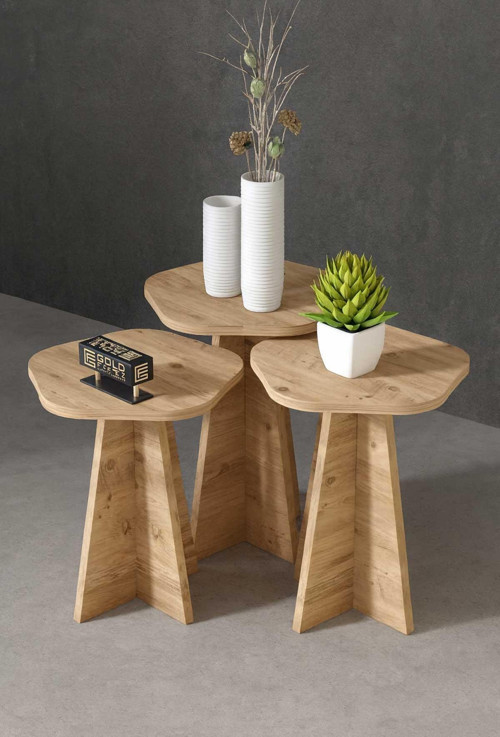 Şık tasarımı ve sağlam yapısıyla yaşam alanlarınıza estetik katan 3’lü Zigon Sehpa Seti, hem dekoratif hem de fonksiyonel kullanımlar için idealdir.; • Üst Tabla Malzemesi: Suntalam • Ayaklar: Suntalam • Gönderim Şekli: Demonte (Kurulum için gerekli tüm bağlantı elemanları kutu içerisindedir.; )